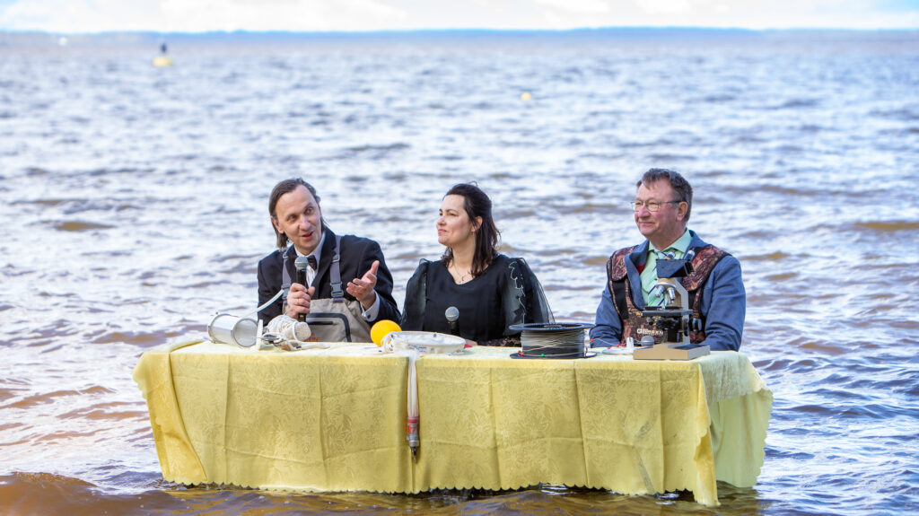 Teadlased tulid aerupaadiga, järveuurijate täisriietus seljas ning kikilips ees, et oleks soliidsem. Lõpuks istusid nad kaldavees laua taga ja vastasid küsimustele.